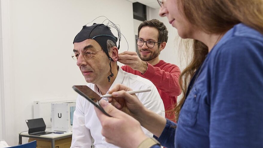 • Labormitarbeitende bereiten die Messung von Gehirnströmen vor.